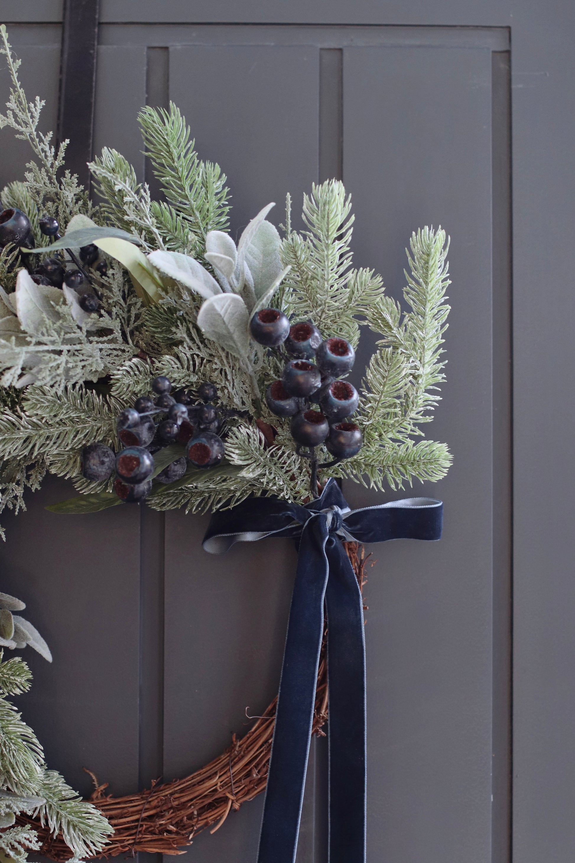 Handmade on a rattan grapevine base, with seasonal foliage including spruce, pine, eucalyptus and more, with delicate rich blueberries. Finished with a navy velvet bow.