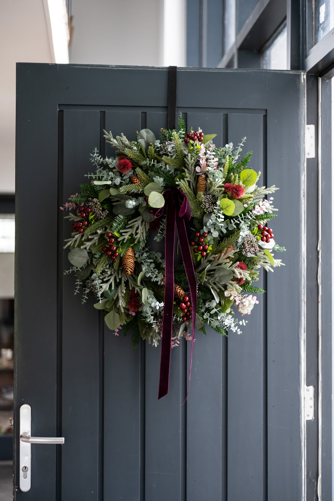 Handmade with rich burgundy toned berries and seasonal foliage, the wild mulberry wreath will really warm up your door for the festive season.